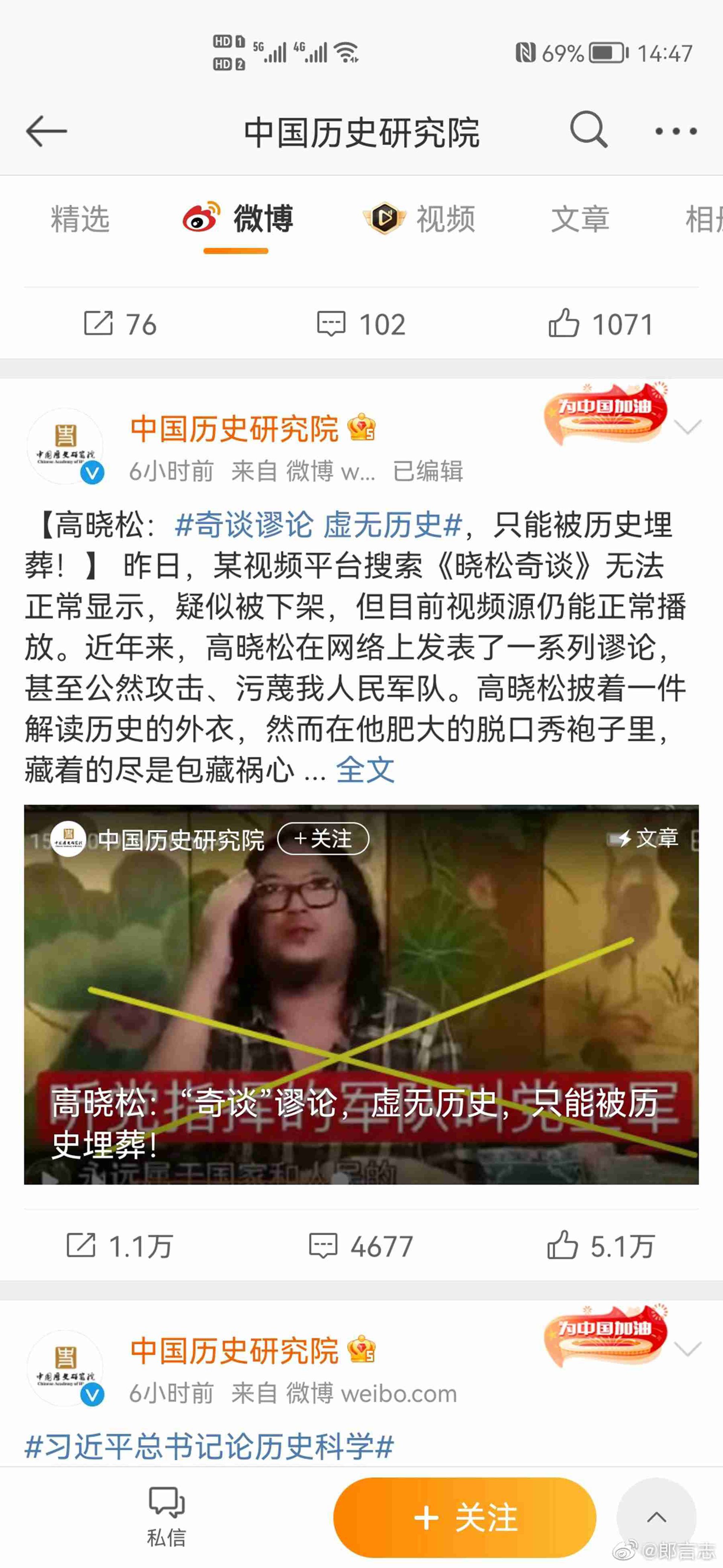 中国历史研究院28日在官方微博发表题为《高晓松:“奇谈”谬论,虚无历史,只能被历史埋葬》的文章。