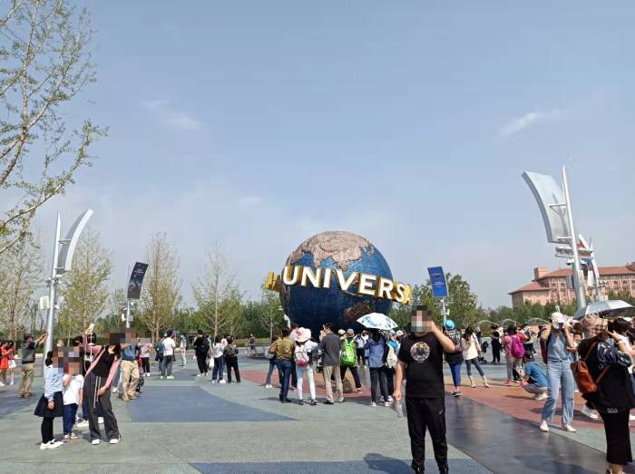 人聲鼎沸的游覽者中,有穿著“哈利波特學院服”的年輕人,也有坐在輪椅上被推行的老年人,還有不少父母攜兒童前來。標志性的“旋轉地球儀”前方,許多人駐足留影。臨近安檢處,有壹處專門租賃輪椅的地方。