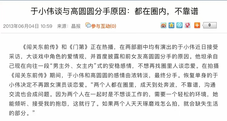 不過因為2人聚少離多,最終這段感情也僅維持了2年,經歷這段無疾而終的戀情,於小偉表示:以後不找圈內的人談戀愛,不靠譜。