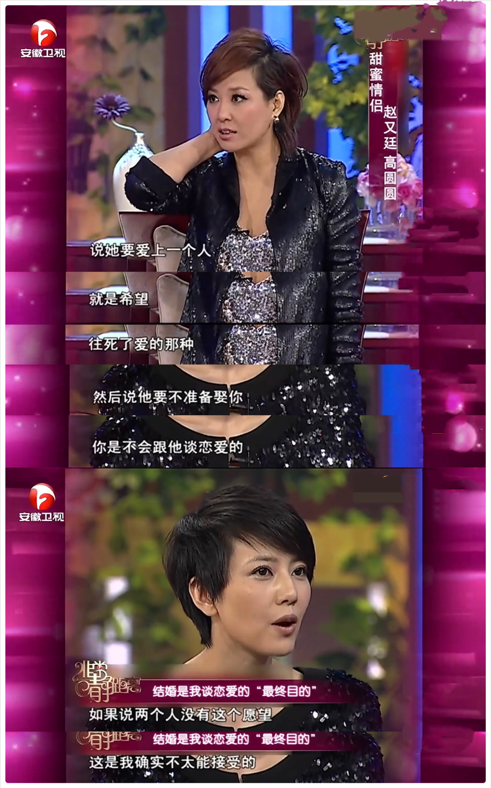 高圓圓後來在節目中表示,坦言自己每壹段感情,都是奔著結婚的目的去的。