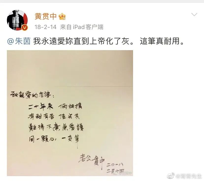 其中的冷暖,只有他們自己知道。黃貫中的浪漫與溫柔,寫在紙上,刻在心裡。 相愛的20多年裡,黃貫中無時無刻不在表達著他對朱茵的愛,微博上除了音樂就是給朱茵寫的情詩: “我永遠愛你,直到上帝化成了灰。”“遇見她,已經花光了我所有的運氣。我樂意當牛糞。”“聽到她的撒嬌,我要深吸壹口氣,才敢走出來。” 曾經叛逆的搖滾青年,全部的柔情都給了朱茵。