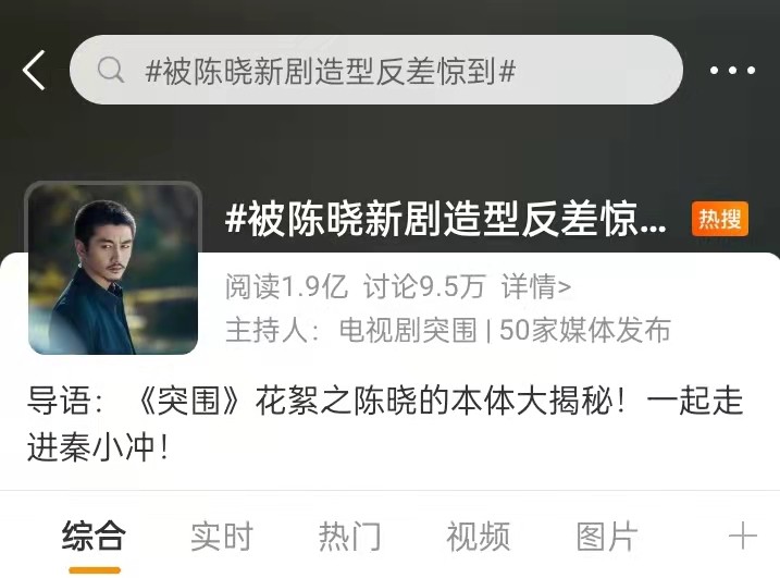 《突圍》未播先火對於觀眾來說應該是情理之中的,讓大家沒想到的是在開播之前,陳曉在劇中的造型竟然能上熱搜,並且小火了壹把。