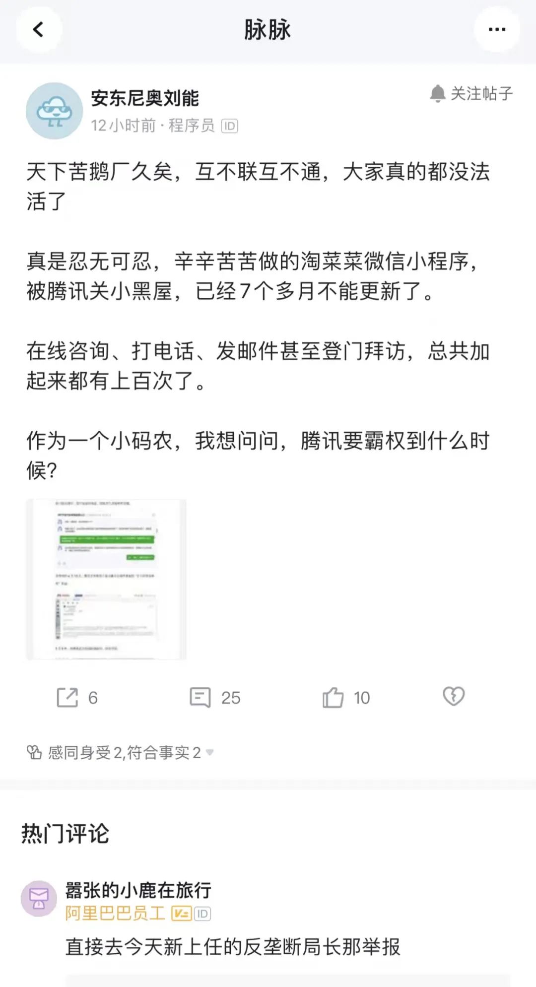 四是地歌网关注到脉脉上一位名为“程序员.安东尼奥刘能”的用户发布了一个帖子,这位显然是淘菜菜程序人员在哀叹,“辛辛苦苦做的淘菜菜小程序,被腾讯关小黑屋,已经7个多月不能更新了!”