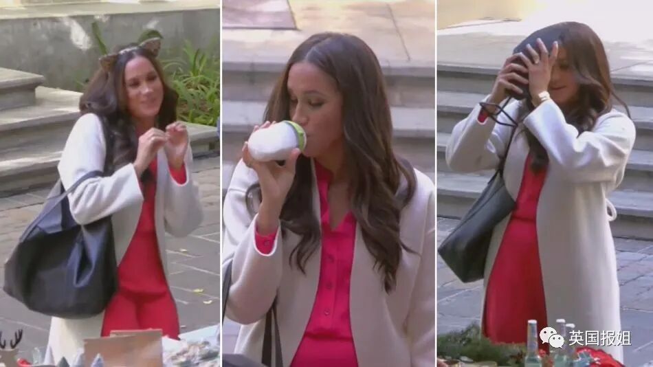 节目里,梅根配合主持人艾伦的指令,做出了各种奇奇怪怪、匪夷所思的举动,说是恶作剧,但当你看到梅根在路边小摊前发出奇怪呻吟、突然深蹲、戴猫耳、模仿花栗鼠甚至开始嘬奶瓶的时候,你可能还是会忍不住质疑这究竟是在做什么…