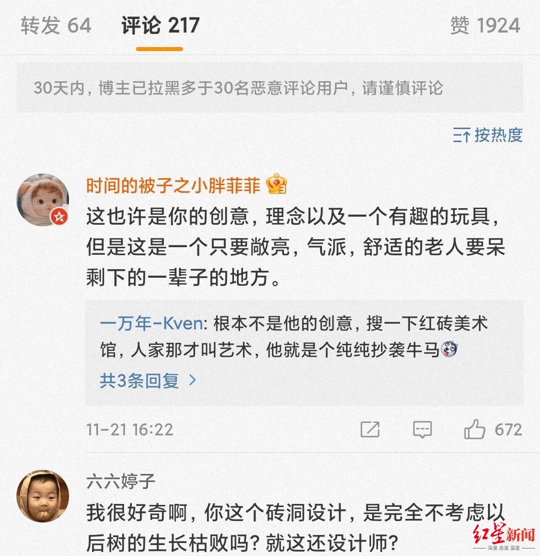 红星新闻记者看到,不少网友涌入陶磊的个人微博下评论,除了质疑,还有不少谩骂。红星新闻记者多次联系陶磊,但截至发稿前暂未回应。陶磊团队此前回应称,“ 设计进行中和业主之间是有充分沟通的,对老人的生活习惯也有长时间的观察。”对于网友质疑,其团队表示:“很多评价上的疑虑是在没有完整看节目或者对建筑空间不熟悉导致的。砖墙镂空只出现在院墙,或者卫生间玻璃高窗外侧,并非主体墙体上,对保温不会有任何影响。”
