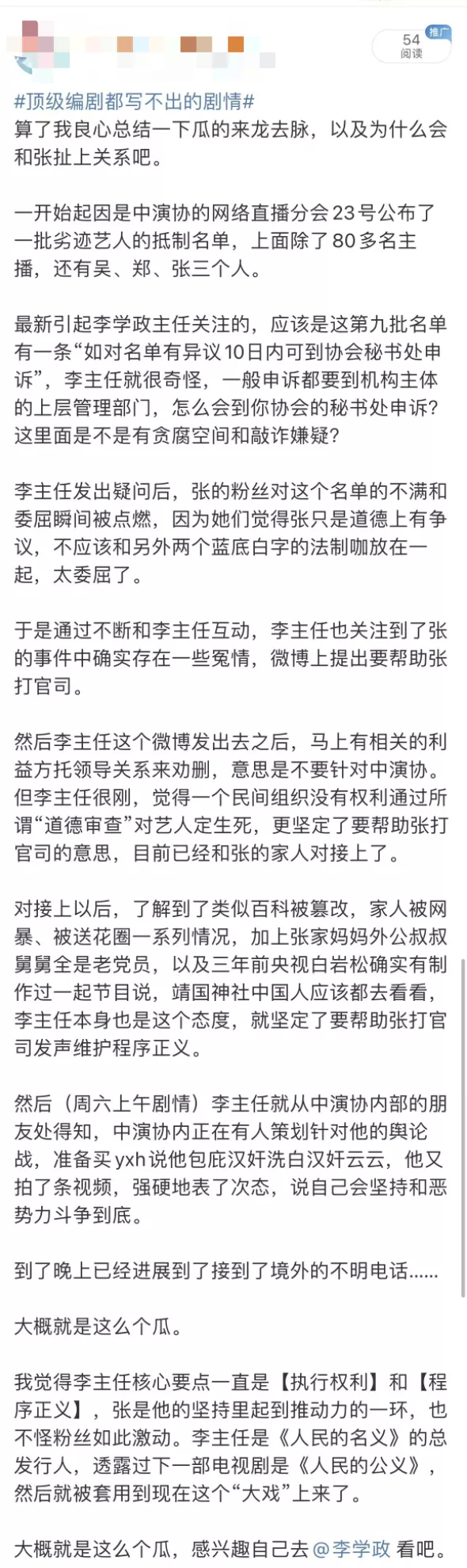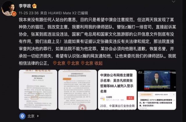 李学政还发文表示在对中演协会事件了解的过程中,对张哲瀚被封杀事件产生质疑,他表示将会用律师团队对张进行法律支持!