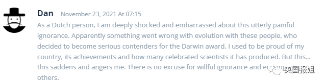 “作为一个荷兰人,我对这种令人痛苦的无知感到深深的震惊和尴尬。显然,这些人的进化出了问题。我曾经为我的国家、为它的成就,为它孕育了那么多着名的科学家而骄傲,但这…这只让我觉得悲伤与愤怒,故意忽视并危及他人,没有任何借口可言。”
