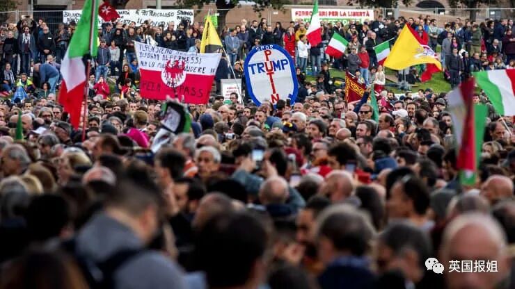 意大利罗马,依然是大批人群聚集,反对强制执行的意大利版本“绿色通行证”。