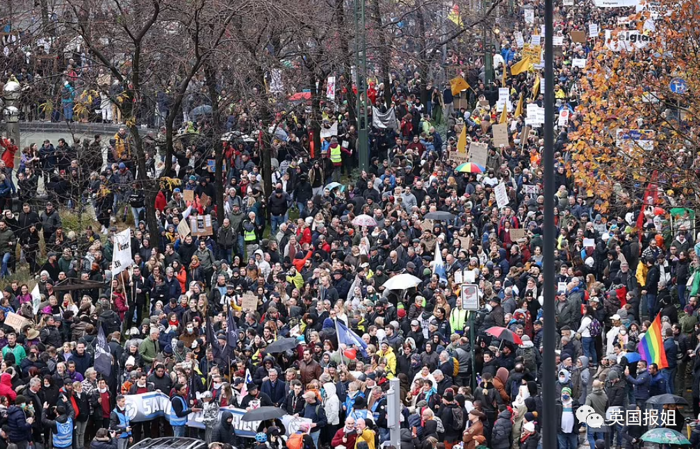 与此同时,在比利时,数万人聚集在布鲁塞尔市中心游行,抗议者和警察发生了冲突。