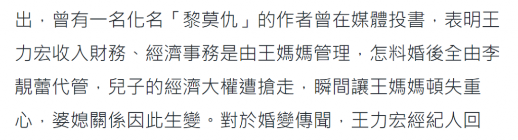 从李靓蕾的叙述看,王力宏让父母出面处理自己和妻子的纷争,自己偷偷躲在背后,早就不是第一次了。