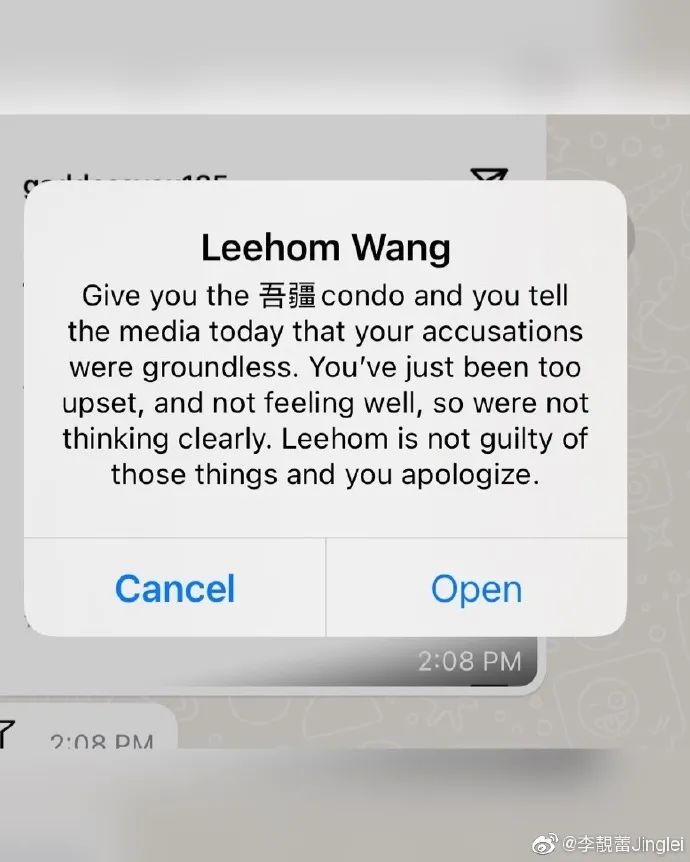 李靓蕾坚决回绝,并要求王力宏今天下午三点之前,公开道歉。