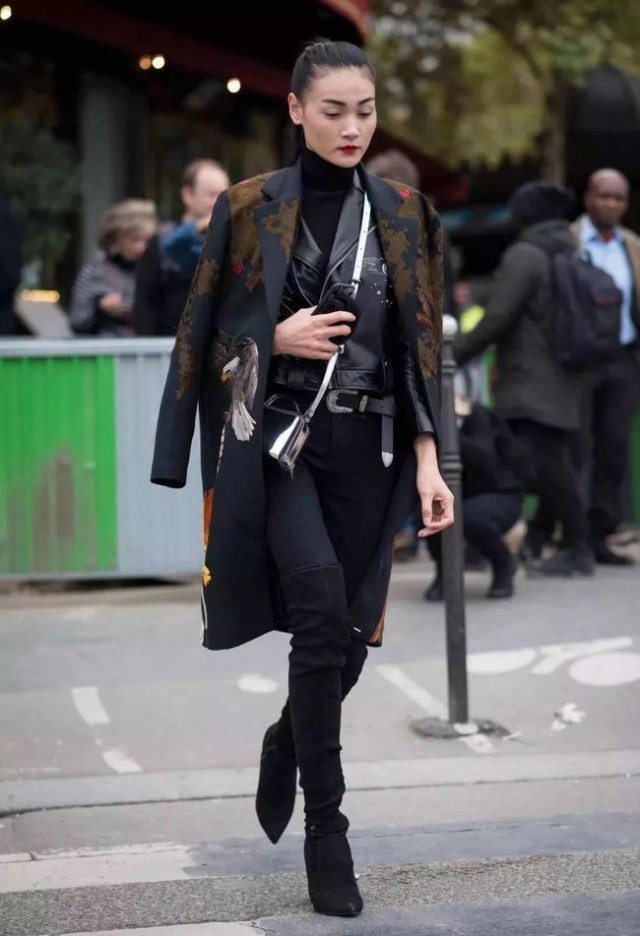 呢大衣搭配壹件機車皮衣,大氣中帶著冷艷,很酷了!