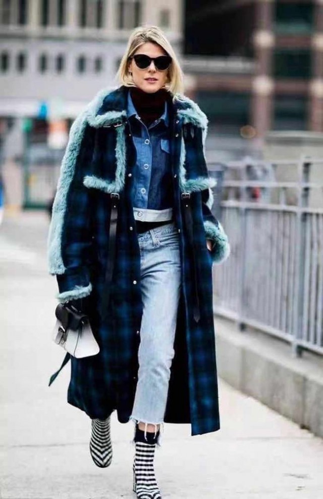 毛毛大衣+牛仔衣的造型真的摩登又時髦!