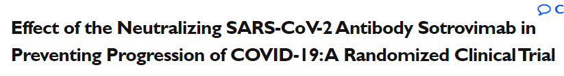 在最近的壹項隨機臨床試驗中,在 1,057 名患者中,使用 sotrovimab 使得住院超24小時或者死亡的機率減少了 79%。不過結果尚未經過同行評審。