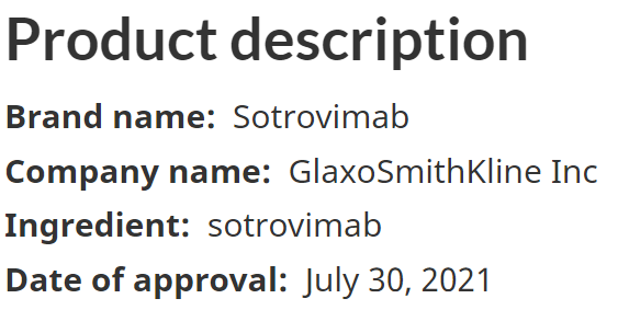 葛蘭素史克 (GlaxoSmithKline )的sotrovimab 藥物早在去年 7 月份就被加拿大衛生部批准使用,僅用於患有嚴重疾病導致住院或因年齡或醫療條件死亡的高風險 COVID-19患者。