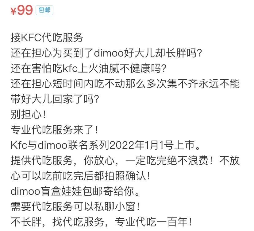 據了解,這次的“代吃”服務大致分為叁種情況:壹是雙方各自承擔壹定套餐費,比例由雙方協商而定,抽中的公仔歸邀請“代吃”的壹方;贰是買家全款支付套餐費,拿走公仔,餐食全部給代吃人;還有部分買方因活動尚未覆蓋到自己所在城市,幹脆花錢跨城找代吃,只為自己求得盲盒。