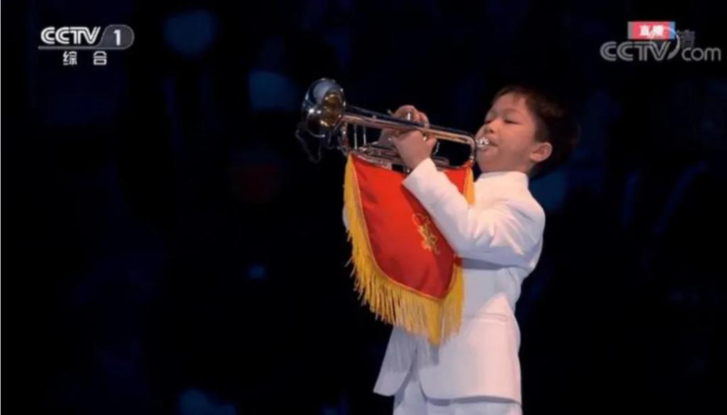 在传递国旗的环节,一名小男孩站在旗杆下,用小号吹响了《我和我的祖国》。他正在换牙,吹得不稳,水平稚嫩。" 没有表演感,最直抵人心。" 张艺谋说。