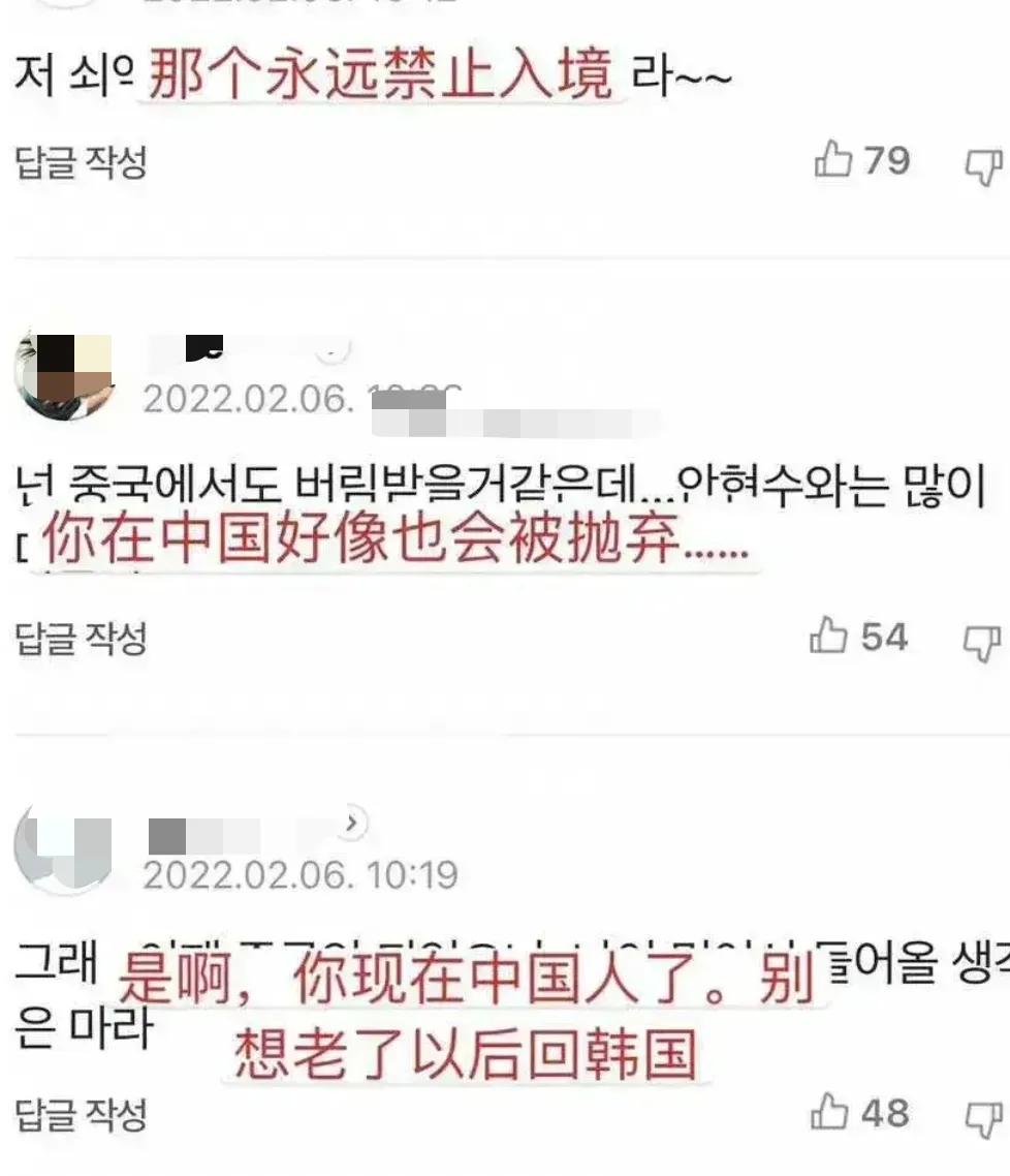 各种言语讽刺、攻击安贤洙,说他是“卖国贼”、吃里扒外、没有道德心、开除国籍、限制入境等等,甚至连安贤洙的家人都带上了。