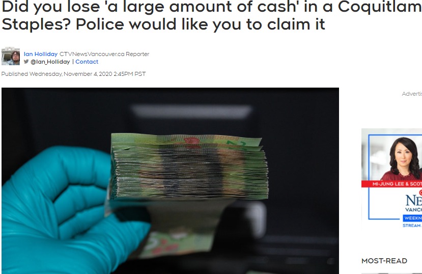 就在去年,高贵林骑警也寻找把“大量现金”遗失在当地商店Staples的失主。