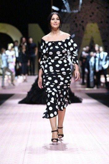 莫妮卡曾经在54岁的时候,身着波点长裙出现在米兰时装周上。身材明显发胖的她腰部褶皱明显,面部岁月痕迹浓郁。