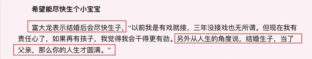 富大龙是很喜欢小孩子的,刚与饶敏莉结婚不久,他就公开表示婚后会尽快生子,他还说:“结婚生子,当了父亲,那么你的人生才圆满。”
