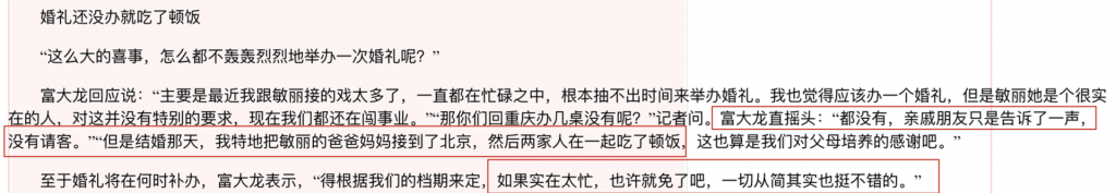 饶敏莉与富大龙结婚并没有办婚礼,只是告知了亲戚朋友一声,请双方父母吃了顿饭,富大龙当时还说:“如果实在太忙,也许就免了吧。”