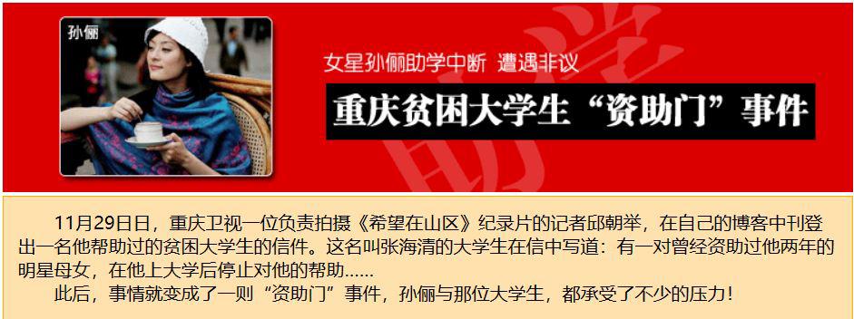 因为记者邱朝举的网络曝光,让孙俪在2006年底,陷入了一场“捐助门”风波。