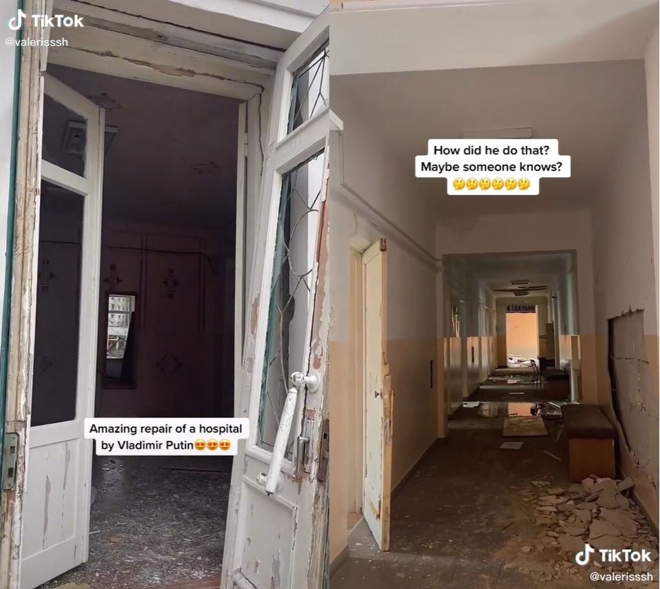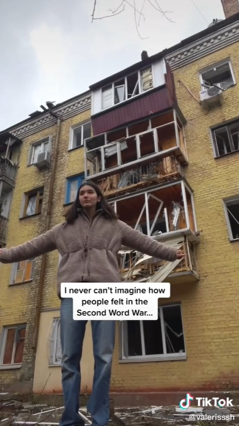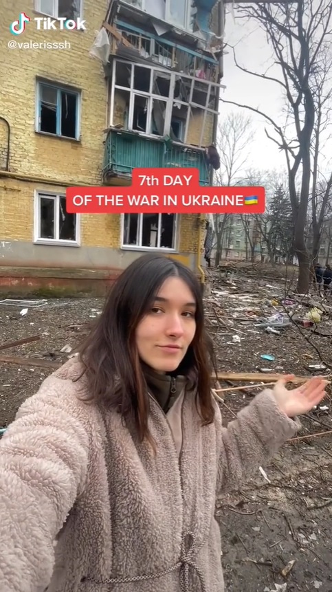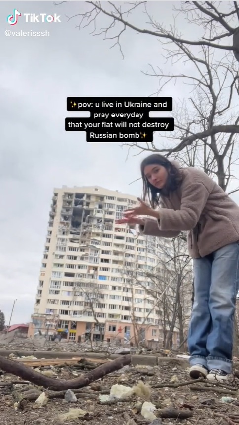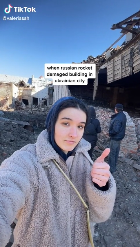瓦莱丽娅的视频风格有着浓浓的黑色幽默,经常能看到她摆着搞笑姿势,像介绍旅游景点一样,介绍被炸毁的楼房。