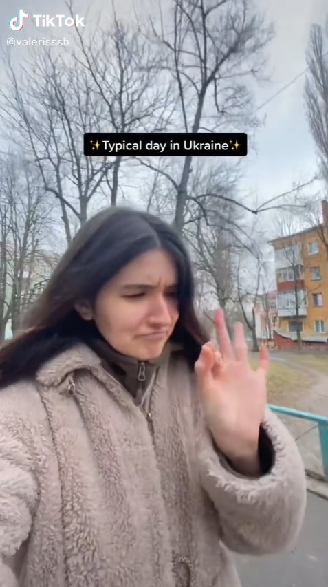 在一个名为“乌克尔人的普通一天”的视频里,瓦莱丽娅在地面上走着走着,突然听到战争警报声。