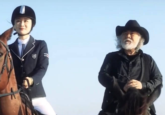 而张纪中,则戴着牛仔帽和黑色眼镜,走在前方,帮妻子拉着马。