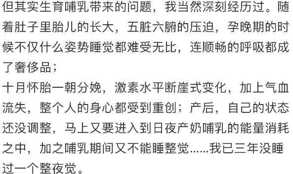 产后激素水平发生断崖式变化、气血流失,加上日夜产奶哺乳需要消耗能量,她竟然已经有三年没有睡过整觉了。