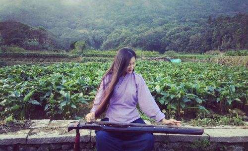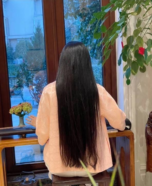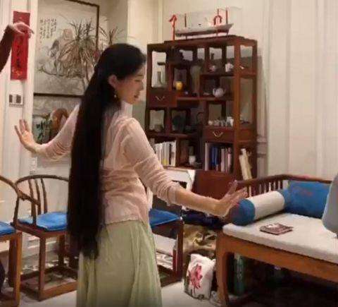 张纪中在社交平台上晒出太太一头乌黑长头发弹琴的视频。