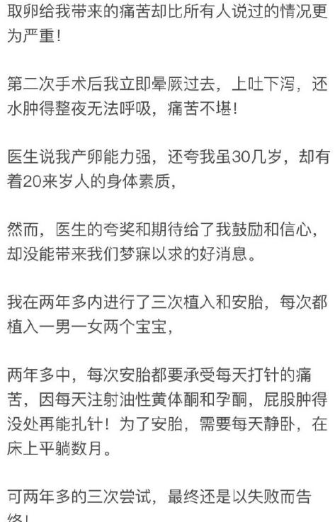 她在发文中曾经表示“备孕之初,看遍了天下的中医、神医,遵循医嘱日日按时往肚子里灌苦水,喝药喝到想死的心都有。”