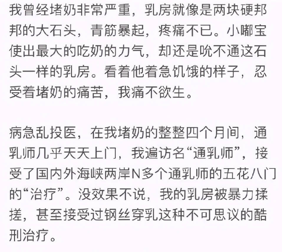 育儿的过程同样不美好,她坚持母乳喂养,却因为堵奶痛不欲生,还遭遇了钢丝穿乳的酷刑。