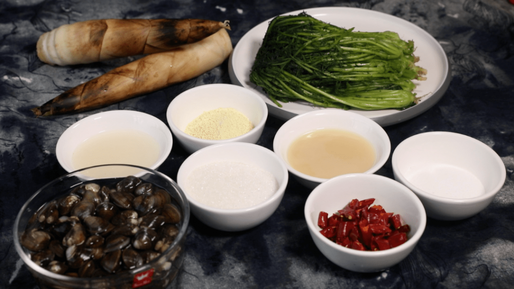 / 食材 / : 200g雪里蕻、500g蚬子、100g春笋