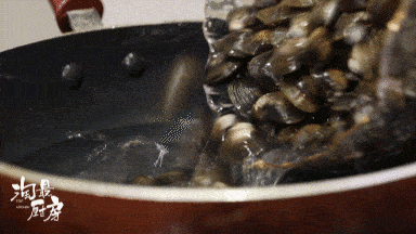 将蚬子冷水下锅,加入1调羹(15ml)料酒去腥。