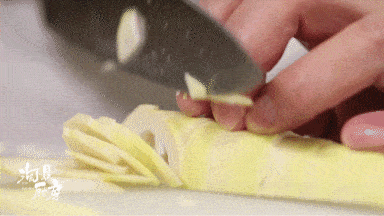 春笋改刀斜切成片,放入冷水中,加1.5调羹(22.5g)盐,去除涩味。