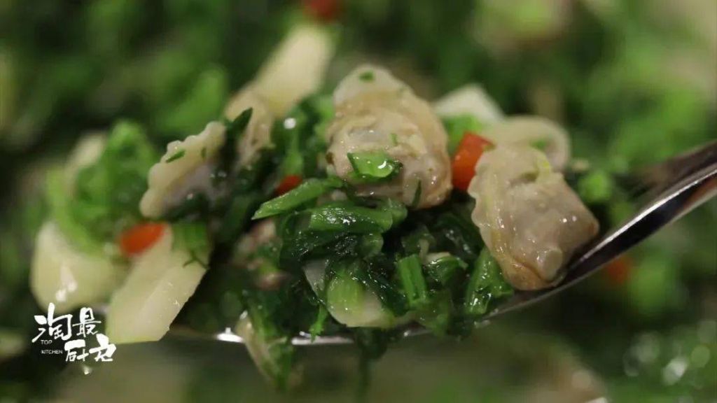炒香后,放入笋片和蚬子肉翻炒。