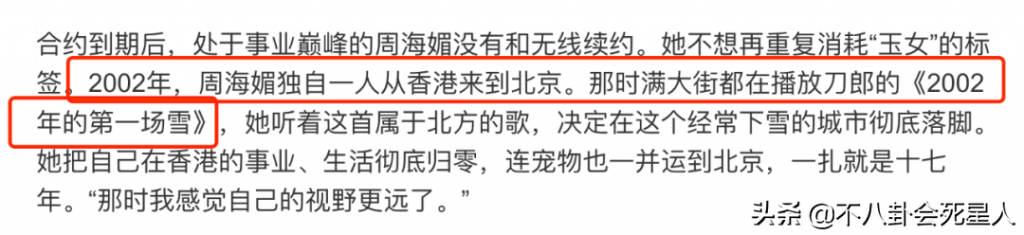 千禧年初,她早早地就定居了北京。网友疯传的一个版本是:周海媚在2002年在内地拍戏时,发现大街小巷都在播放《2002年的第一场雪》这首歌,她对歌中大雪纷飞的北方充满了向往,于是决定买房定居北京。