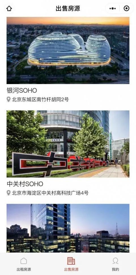 從微信“SOHO中國公開租售平台”小程序可以看到,該公司此次計劃出售的“資產包”主要包括位於北京的銀河SOHO、中關村SOHO、朝外SOHO、SOHO北京公館、朝陽門SOHO、叁裡屯SOHO、建外SOHO,以及上海的SOHO中山廣場、SOHO東海廣場9個項目。