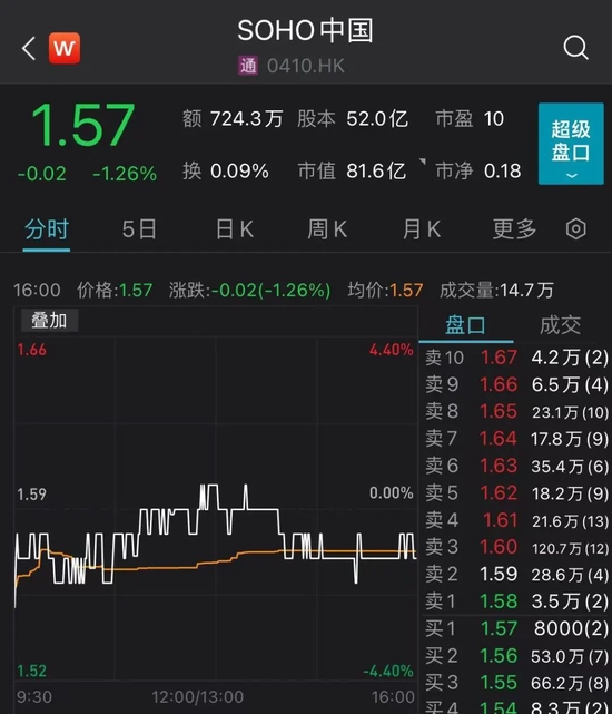截至發稿,SOHO中國股價為1.57港元/股,跌幅1.26%,市值81.6億港元。