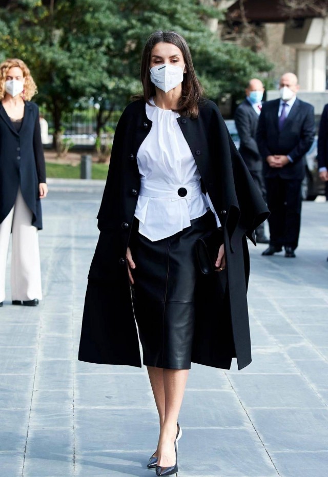這樣的造型固然能夠劃分好比例,但其實也很容易顯得腿短。模糊掉的腿部曲線想要營造大長腿的既視感,自然是少不了高跟鞋的加持啦。就連170cm的萊蒂齊亞都要穿恨天高,咱們普通人在照抄的時候可不能忘了這腿長神器啦。同色系高跟能夠增加氣場還能提升造型質感,這小心思不學真的虧大了。