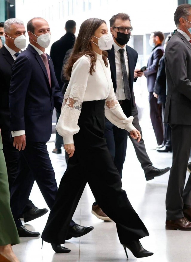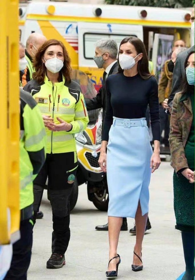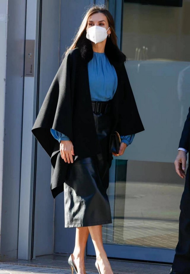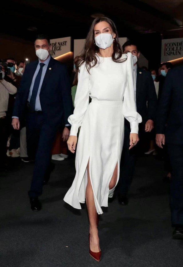 這樣的造型固然能夠劃分好比例,但其實也很容易顯得腿短。模糊掉的腿部曲線想要營造大長腿的既視感,自然是少不了高跟鞋的加持啦。就連170cm的萊蒂齊亞都要穿恨天高,咱們普通人在照抄的時候可不能忘了這腿長神器啦。同色系高跟能夠增加氣場還能提升造型質感,這小心思不學真的虧大了。