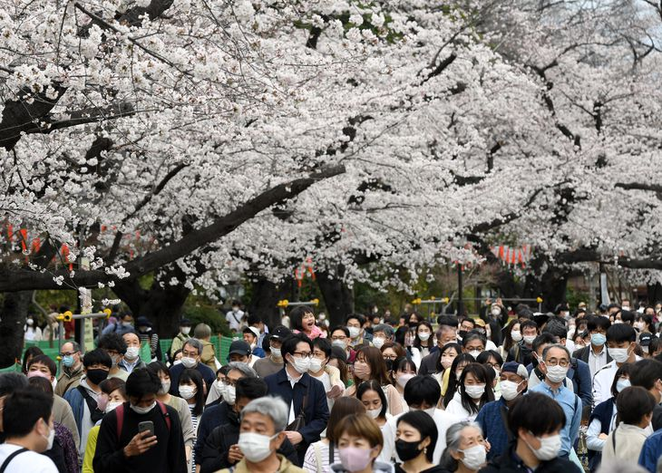 日本東京遍地落櫻,不少游人來到公園,在櫻花樹下賞花拍照。