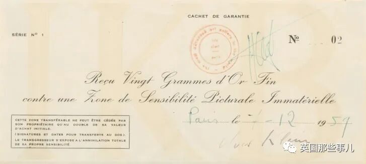 收据不到20厘米宽,售出的是克莱因的想象空间,名为“非物质绘画感受区域”,有克莱因的签名,日期为1959年12月7日。