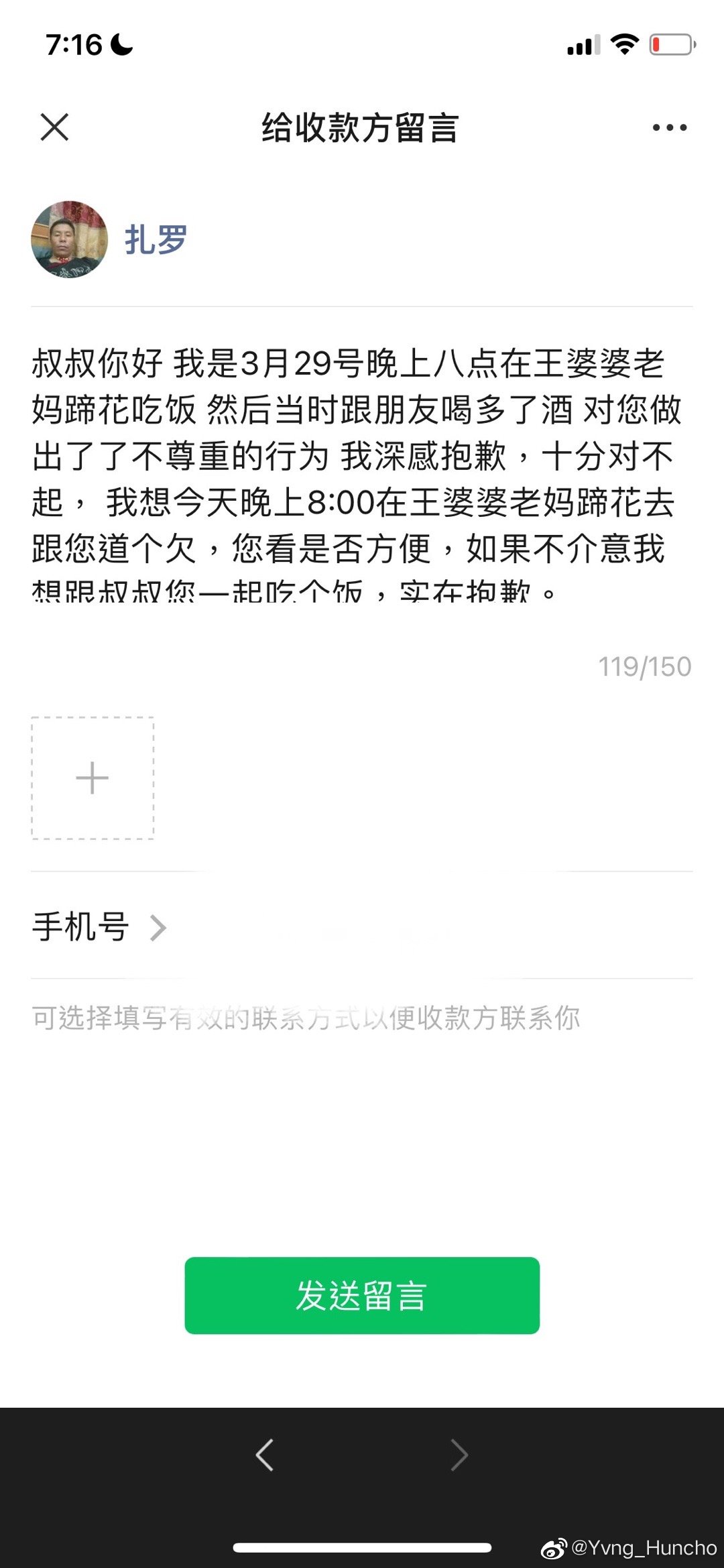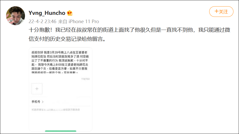 另外,他还在2日深夜发文,称他欲找到卖艺男子当面道歉,但由于找不到人,只能通过微信支付的历史交易记录给他留言,进行道歉。在这条留言中,他称自己“喝多了酒”,才做出了不尊重人的行为。