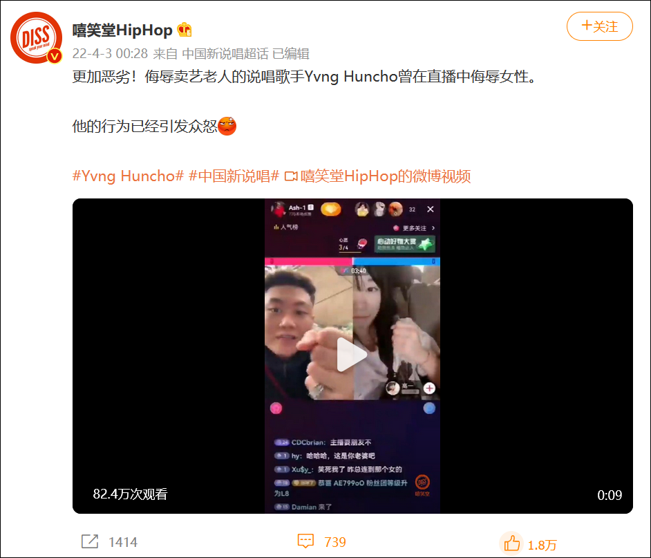 据@嘻笑堂HipHop 3日称,@Yvng_Huncho 曾在与女主播连线时,不仅故意对人竖中指,还用脏话骂人。