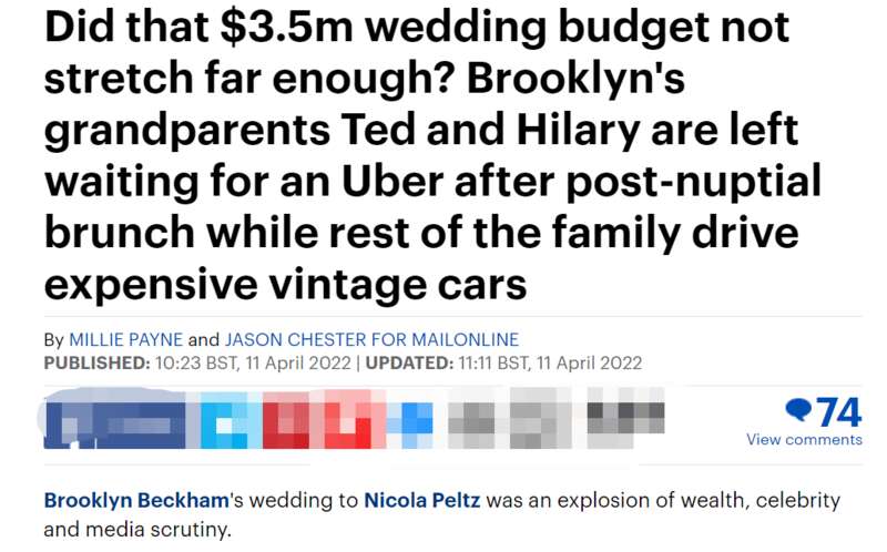 相關報道還登上了每日郵報非常顯著的位置,標題也比較犀利,甚至有些諷刺意味:《350 萬美元的婚禮預算不夠了嗎?布魯克林的祖父泰德和祖母希拉裡在午餐後等待計程車,而其他家人則開著昂貴的老爺車》