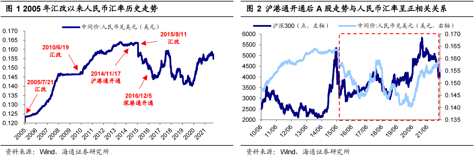我国人民币汇率形成机制经历了多次改革,循序渐进地推动人民币汇率的市场化和国际化。2005年7月21日我国开始实行以市场供求为基础、参考一篮子货币进行调节、有管理的浮动汇率制度。2010年6月19日中国人民银行决定进一步推进人民币汇率形成机制改革,增强人民币汇率弹性。2015年8月11日央行宣布完善人民币对美元汇率中间价报价机制。此外,A股市场也经历了不断开放的过程,2014年11月17日沪港通正式开通,2016年12月5日深港通正式开通,进一步扩大了A股的对外开放。