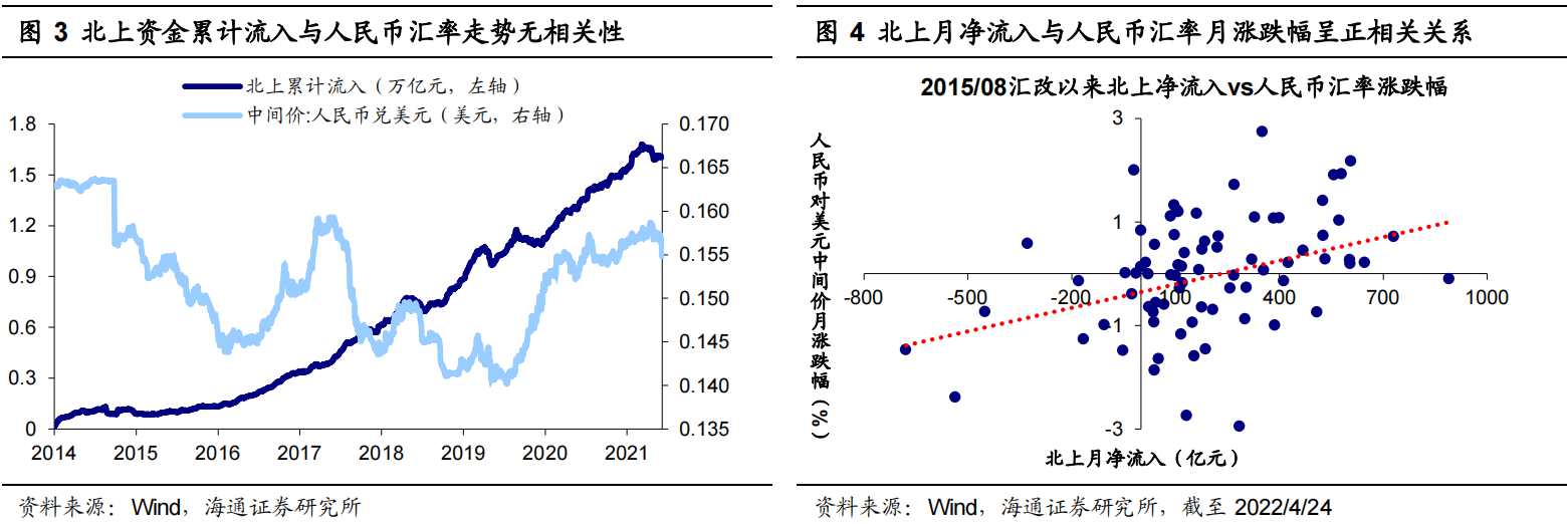 北上资金净流入与人民币升值正相关,但相关性较弱。存量角度,2014年11月17日沪港通开通后北上资金累计净流入量与人民币汇率升值的相关系数仅为-0.15,说明北上资金流入A股的趋势基本不受人民币汇率波动的影响。增量角度,沪港通开通后北上资金月度净流入金额与人民币月度升值幅度的相关系数为0.32,呈弱正相关关系,这说明人民币升值幅度影响外资流入A股的规模。